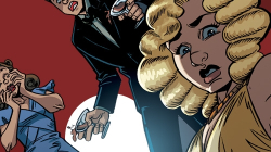Harvey’s ear for dialogue is excellent, using 1930s slang like “rubes,” “holy smokes,” and “dollface” without overdoing it. Levens does a great job depicting Los Angeles during the Golden Age of Hollywood—hair and clothing, as well as architecture, all ring true—but she has a distracting habit of drawing short horizontal lines across the bridge of her characters’ noses. Few escape this treatment, whether male or female, of varying age or ethnicity, and it immediately draws the eye, slightly diminishing the luster of Levens’s otherwise outstanding art.